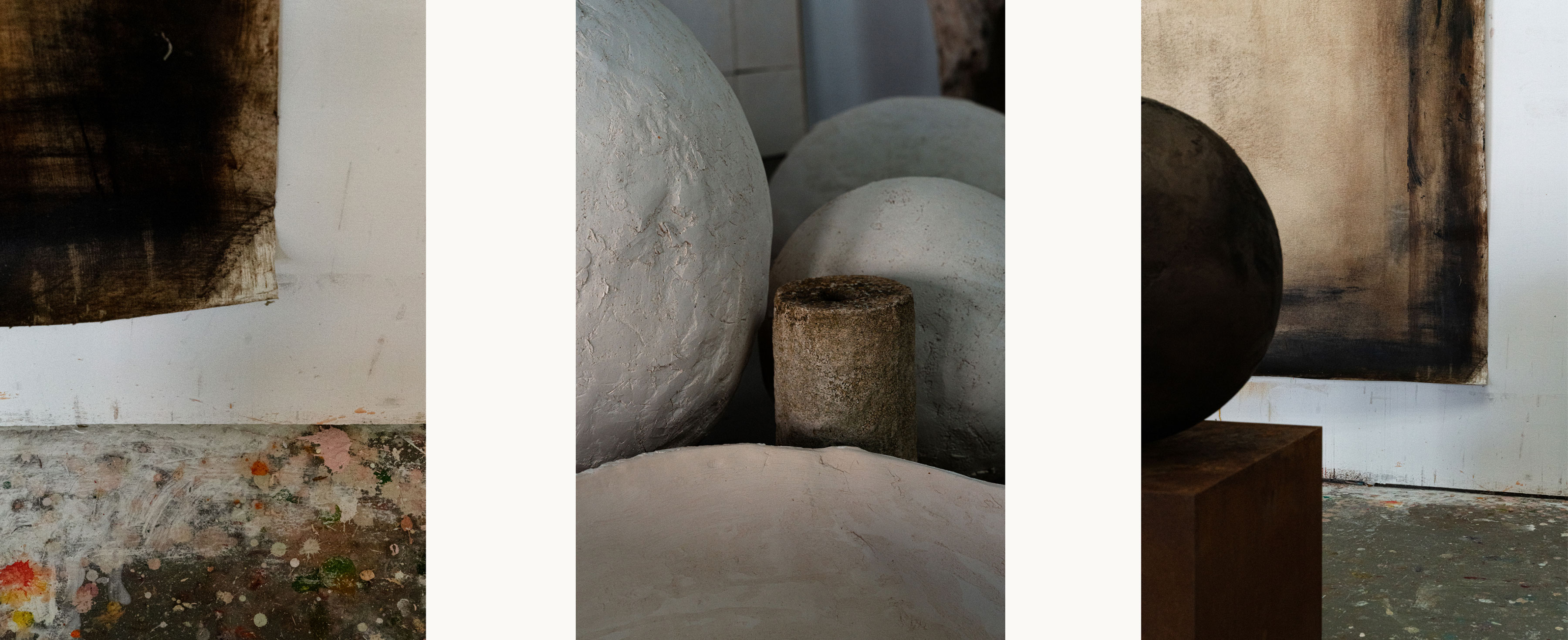 Balagué’s “Esferas” materialize gravity, transcendence, and universality. Crafted from smoke-fired terracotta clay with coarse grog and handmade ceramics incorporating seaweed and driftwood, these spheres speak of elemental harmony and natural forces.