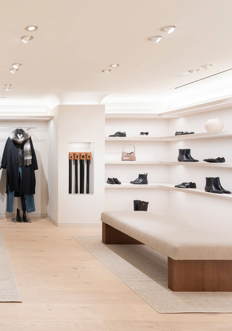 La propia arquitectura de la tienda crea el mobiliario y define los espacios. La luz natural funciona como elemento clave, dando una sensación general de calidez y luminosidad.