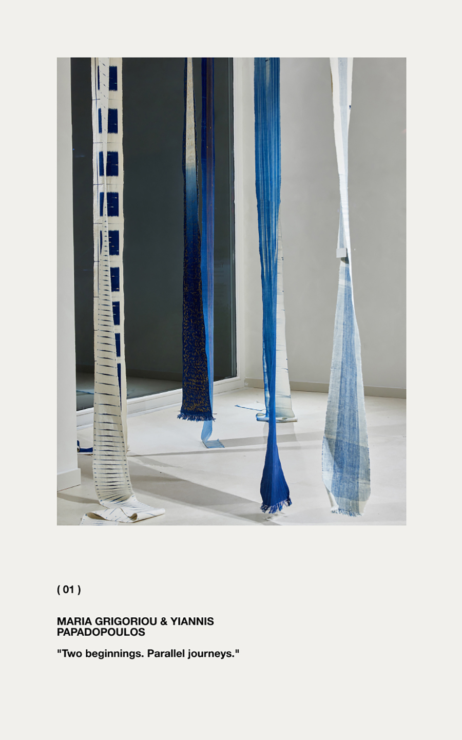 Maria Grigoriou’s art is the result of a two-year journey through an ever-changing seascape, weaving the blue traces of time, rust, and saltwater as a reminder of the ephemeral and transient nature of the warp and weft of our lives. Yiannis Papadopoulos’s work re-evaluates and rejects the superfluous, using repetitive movements and linen threads to weave thoughts that fold and multiply with light and shadow. Both artists have shared a studio in Athens since 1978 and are represented by the Bernier Eliades Gallery in Athens and Brussels.