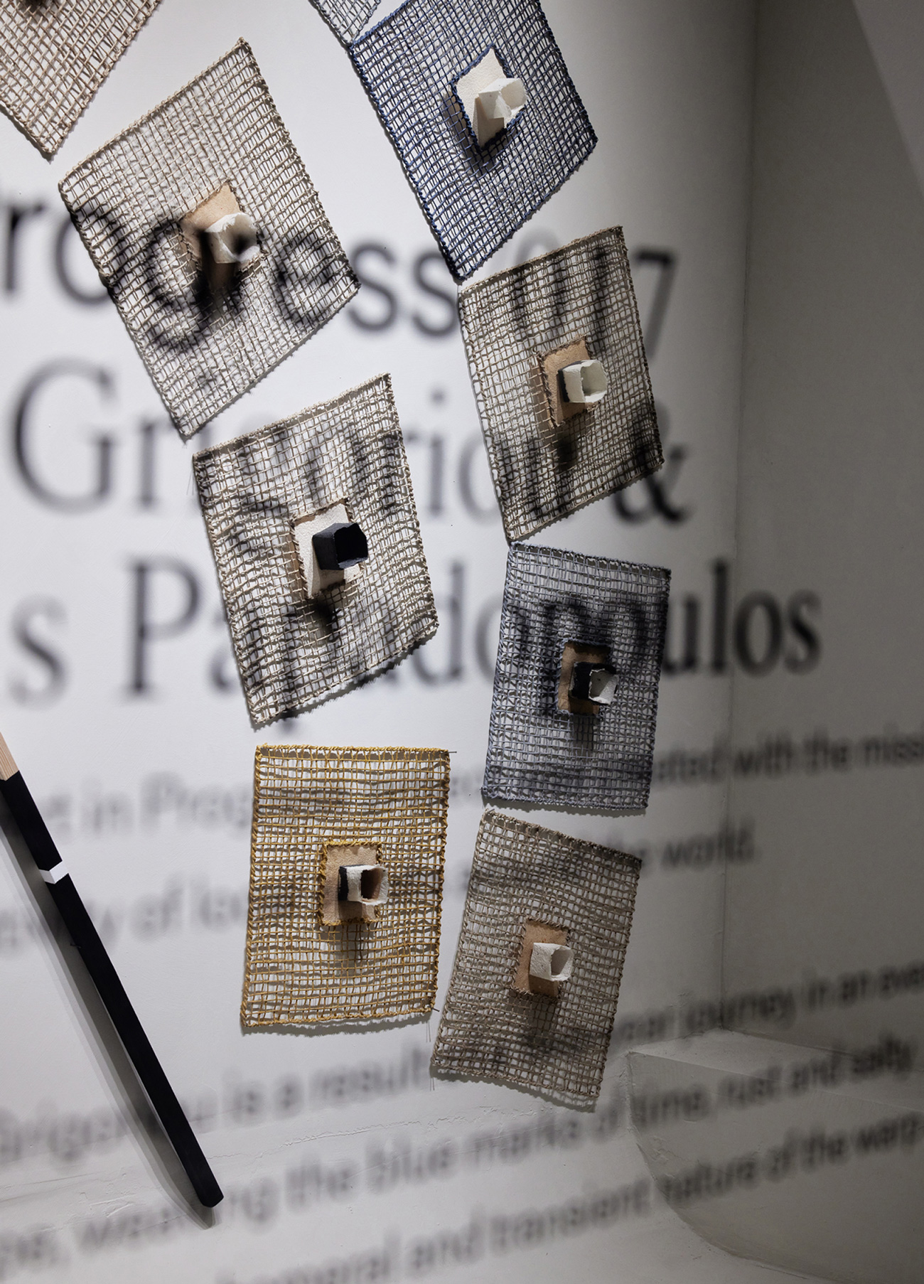 Maria Grigoriou captures the beauty of the ephemeral through blue traces of rust and saltwater, reflecting her two-year journey by sea. Yiannis Papadopoulos, through meditative repetition, weaves his thoughts and explores the impermanent and transparent with simple linen string. Together they create sculptural landscapes.