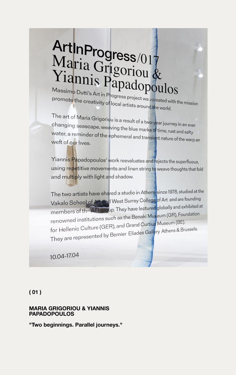The ArtInProgress project by Massimo Dutti was created with the mission of promoting the creativity of contemporary artists from around the world. The latest collaboration features artists Maria Grigoriou and Yiannis Papadopoulos at the Kolonaki store in Athens—a space that reinforces the brand’s new interior concept, where natural light and materials like wood play a fundamental role.